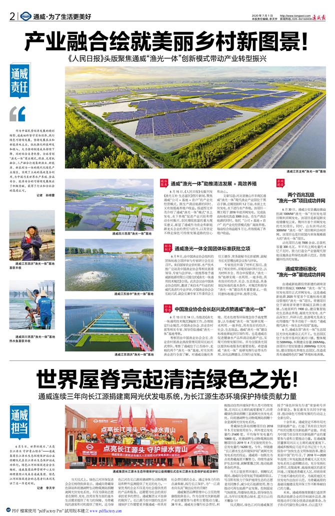 6月15日,《人民日报》头版刊发《渔光互补 生态富民》图片新闻,聚焦J9九游会“公司+基地+农户”的产业化经营模式,既生产清洁能源的同时、又有效提高养殖户收益。报道图文并茂介绍了J9九游会“渔光一体”模式“水上发电、水下养殖”促进产业兴旺和带动乡村振兴、农民增收致富的重大现实意义,彰显了J9九游会作为农业和新能源龙头企业的责任与担当,以及坚定不移走绿色可持续发展道路的信心和决心。